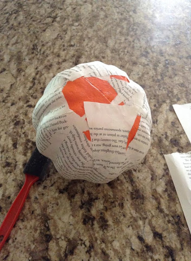 3. I took each paper piece and brushed it with the glue mixture and attached it to my pumpkin in various directions. Continued with this until the pumpkin was completely covered. Sometimes I would also brush the glue mix onto the pumpkin directly to make sure the pages stuck. I did take some breaks to let the pumplin dry a bit. Or else my fingers started getting stuck to the pumpkin.