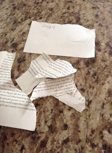 2. Once that was dry I tore up the book pages into small random pieces. Then I mixed the modge podge with some water. I did not measure water to glue ratio, I just did a little to thin it out some.