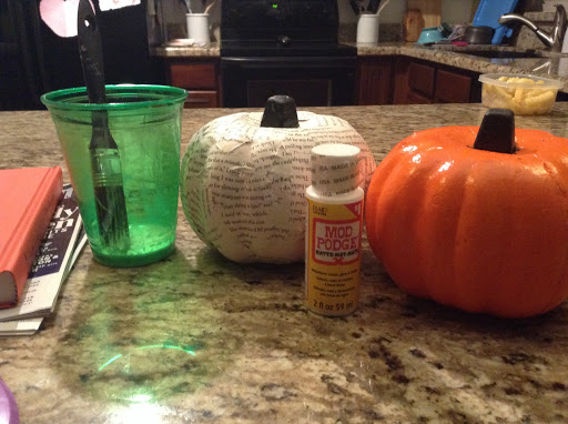 3. I took each paper piece and brushed it with the glue mixture and attached it to my pumpkin in various directions. Continued with this until the pumpkin was completely covered. Sometimes I would also brush the glue mix onto the pumpkin directly to make sure the pages stuck. I did take some breaks to let the pumplin dry a bit. Or else my fingers started getting stuck to the pumpkin.