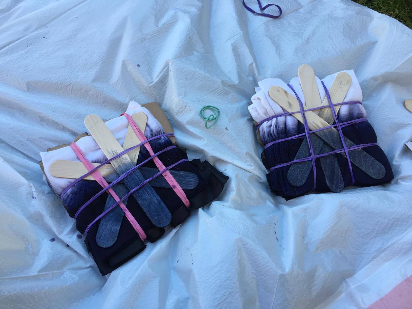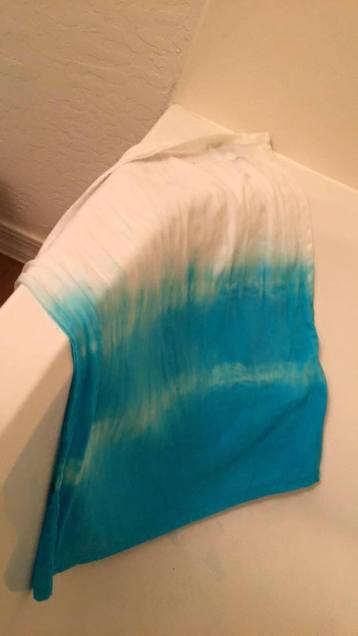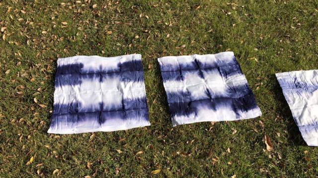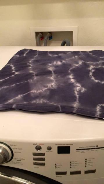 In the square ones I stuck cardboard between the folded added some sticks to make it tight and then rubber banded. My folding was not the fail…you think that would have been! It was in the dyeing process. I mixed the dye according to the directions and even did a test. I was ready for the real deal! Except with the test, I remembered to wet the fabric before dyeing…with the real deal I forgot. I also did not rinse the test after…with the real deal I did. I am not sure which of these led to the demise of my pillows…and I will try to figure that out, next time!