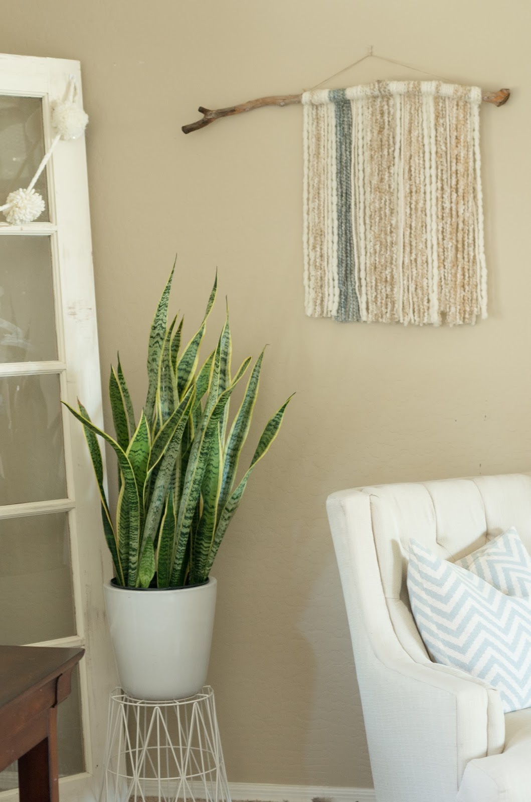 And I also did this yarn wall hanging. I used a stick from the back yard, and 4 different types of yarn, on sale from Joann’s to create a unique wall art for under $20. Plus I have A TON of yarn left over. (I may try a Juju hat knock off…but I digress)